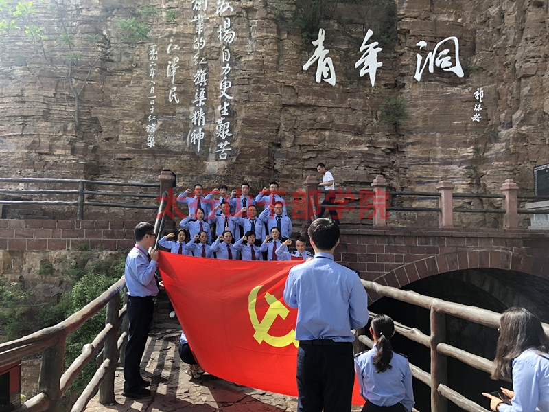 學(xué)員們踏上350米的廊橋——“紅飄帶”,來(lái)到青年洞洞口。1973年,全國(guó)人大常委會(huì)副委員長(zhǎng)郭沫若親自題寫了洞名。洞口刻有李先念、江澤民題詞。學(xué)員們集體在洞口合影留念,并重溫入黨誓詞。